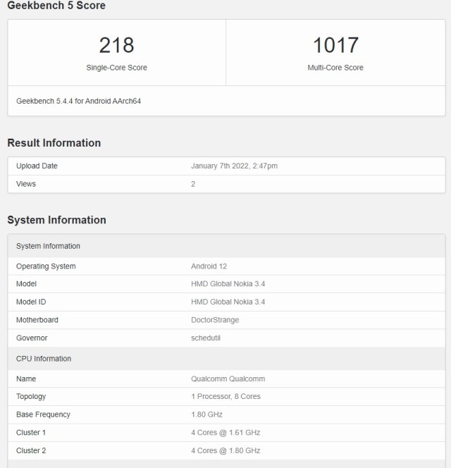 Смартфон работает на процессоре SD460, построенном по 11-нм техпроцессу, в сочетании с графическим процессором Adreno 610. Nokia 3.4 получила новую версию Android в августе 2021 года и теперь была замечена на Geekbench при тестировании с Android 12. Результаты Geekbench для Nokia 3.4 конечно не так высокие, но все же смартфон работает достаточно плавно.