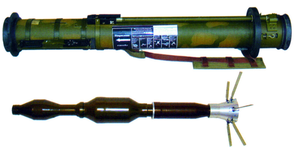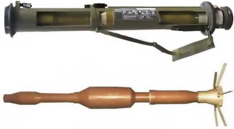 РМГ "Занос-1" и его снаряд (сверху) и РПГ-27 "Таволга" и её снаряд (снизу). У боеприпасов имеются небольшие видимые отличия