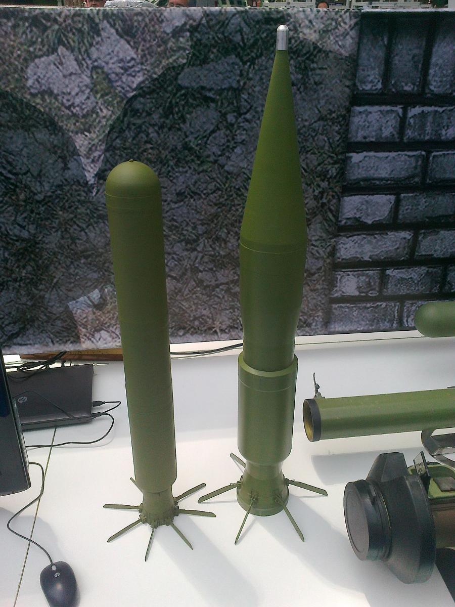 Слева - 90мм противопехотный (противобункерный-противобронетранспортёрный) термобарический реактивный выстрел М79ТБГ к М79 "Оса"; справа - 120мм противотанковый кумулятивный реактивный выстрел к М90 "Стршлен", конструктивно аналогичный М79КМ к М79 "Оса"