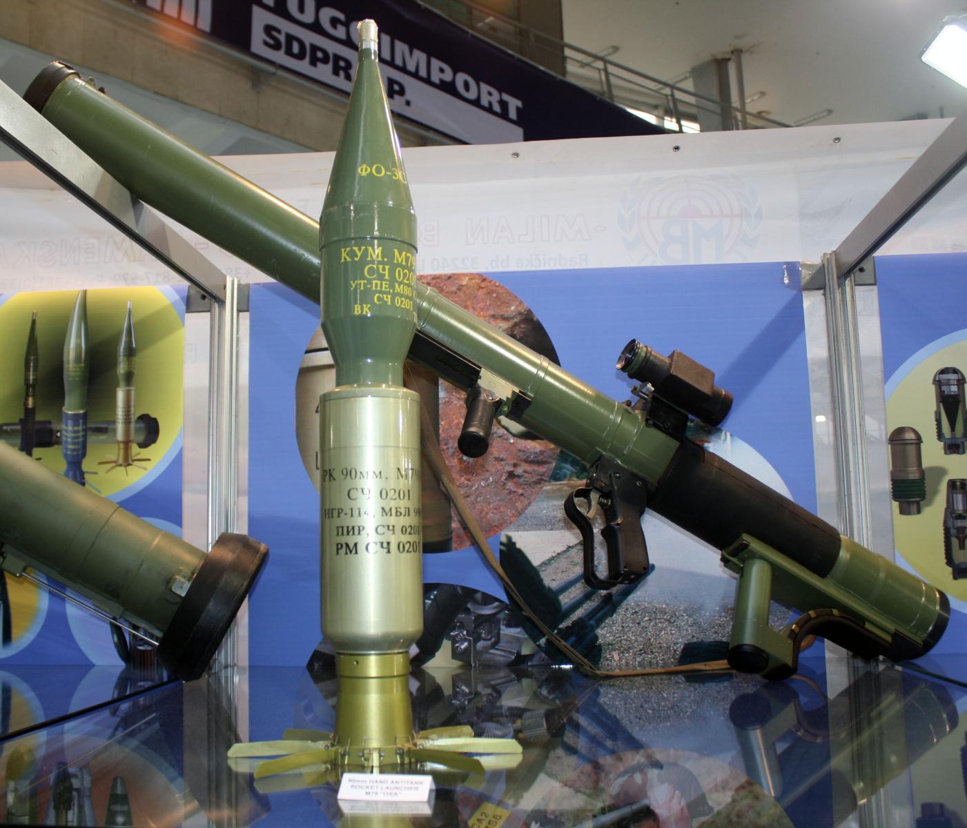 М79 "Оса" с дневным-ночным лазерозащищённым оптическим прицелом CN-6 3.5x и присоединённым картриджем с противопехотным фугасным термобарическим реактивным выстрелом. Рядом в вертикальном положении находятся картридж с противопехотным термобарическим выстрелом и противотанковый кумулятивно-осколочно-фугасный выстрел вне картриджа