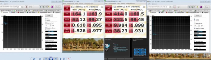Подключил новый Samsung SSD 850 EVO, запустил утилиту, потом пришлось подождать несколько минут, так, как инициализация утилитой дисков больших объёмов занимает некоторое время, я запустил новые тесты, и о чудо:<br/>