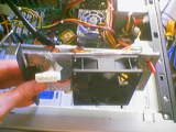 Повесить на такой радиатор вентилятор довольно сложно, поэтому было сделано такое вот сооружение. Это неработоспособная видеокарта для PCI, с которой удалены все радиоэлементы … как красиво сползают чипы памяти в пламени комфорки газовой плиты. На поверхности текстолита метилось положение вентилятора, ну а далее: дрель, лобзик, напильник, наждак. Наметил отверстия под крепеж вентилятора, просверлил и прикрутил последний. В результате если вставить плату в PCI-разъем, то вентилятор оказывается аккурат под радиатором видеокарты. Ради испытаний вентилятор подключается через переключатель и может работать на 5 вольт, 12 вольт или не работать вовсе.