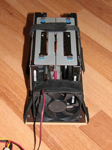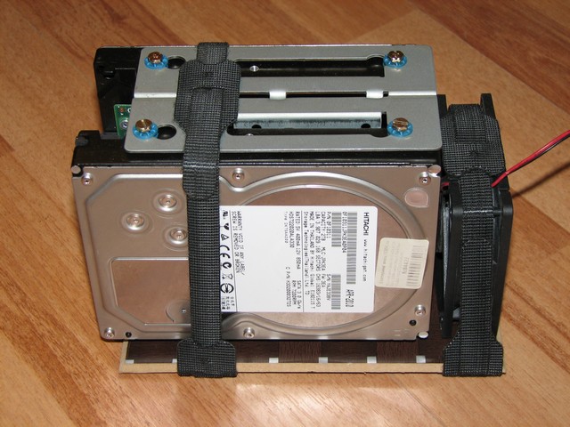 Корзина для винчейчтеров сделана из двух ординарных корзин от старых системников IBM. Винчейстеры расположены электроникой друг к другу. Это во первых ощутимо снижает вибрацию, т.к. шпиндели вращаются на встречу друг другу, а во вторых, воздух от вентилятора идйт в промежуток между винтами и неплохо обдувает электронику. Чтобы улучшить обдув и избежать нагрева той части корзины что соприкасается с паролоном, корзина с вентилятором смонтирована на пластине из ДВП. Крепление - обычные липучки. Они к стати не позволяют корзине "ездить" по паралону, сцепление с подложкой у них очень хорошее.