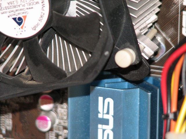 А вот так закреплён вентилятор на прорцессорном кулере. Держится крепко, вибрация от пропелера вообще не передаётся на радиатор.