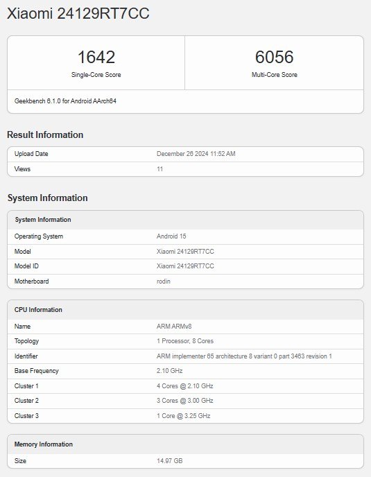 В базе данных Geekbench смартфон Redmi Turbo 4 указан с модельным номером 24129RT7CC, предустановленной ОС Android 15 и 16 ГБ оперативной памяти, а также чипсетом Dimensity 8400, оснащённым одним ядром с тактовой частотой 3.25 ГГц, тремя ядрами, достигающими частоты 3.0 ГГц, и четырьмя ядрами с частотой 2.1 ГГц.