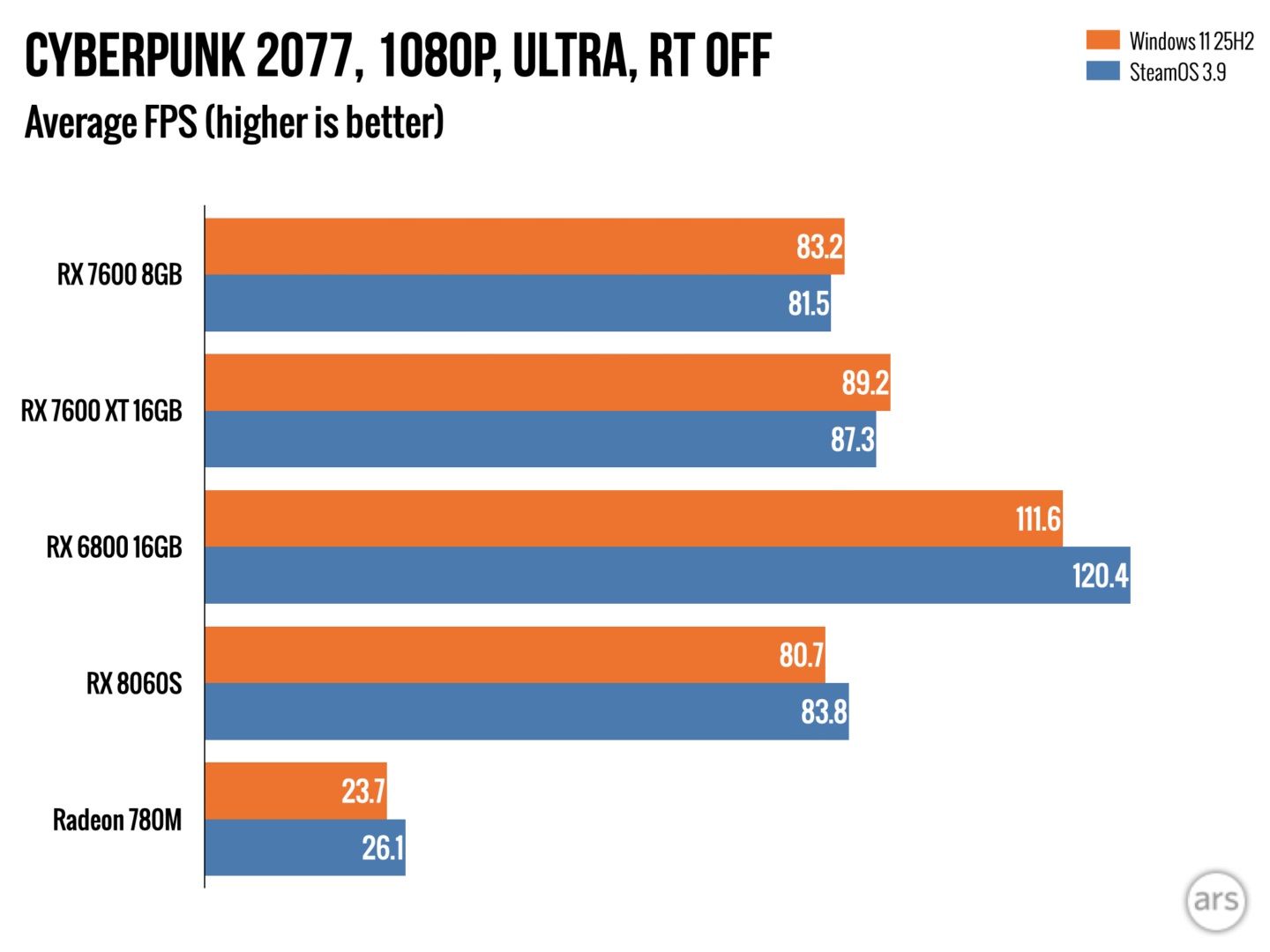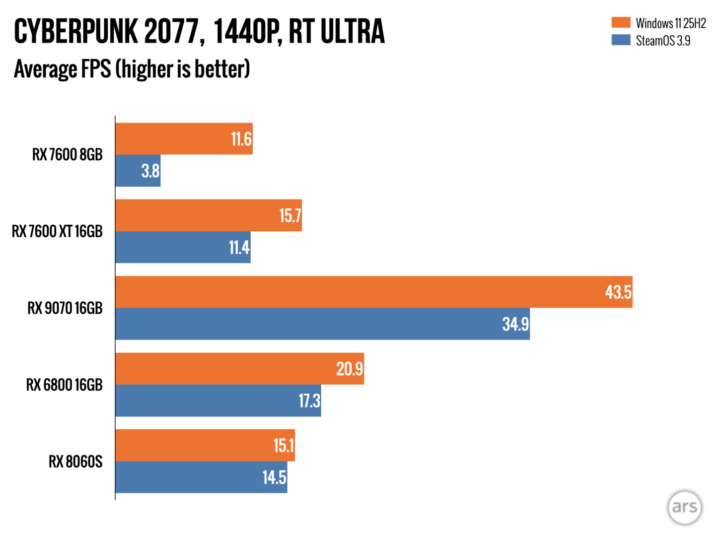 С 16-ГБ моделями снижение fps не так выражено — например, RX 9070 16 ГБ, работающая на Windows 11 25H2, в Cyberpunk 2077 и Forza Horizon 5 в 1440p с RT обеспечивает на 25 и 17 % больше fps по сравнению со SteamOS 3.9.