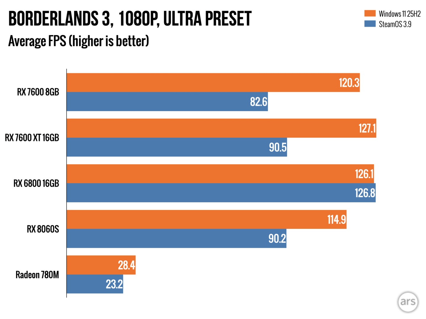 Интересно, что встроенные GPU в SteamOS работали более стабильно в большинстве игр, за исключением Borderlands 3, где Windows 11 25H2 позволила достичь RX 8060S роста fps на 27 %, а Radeon 780M — на 22 %.