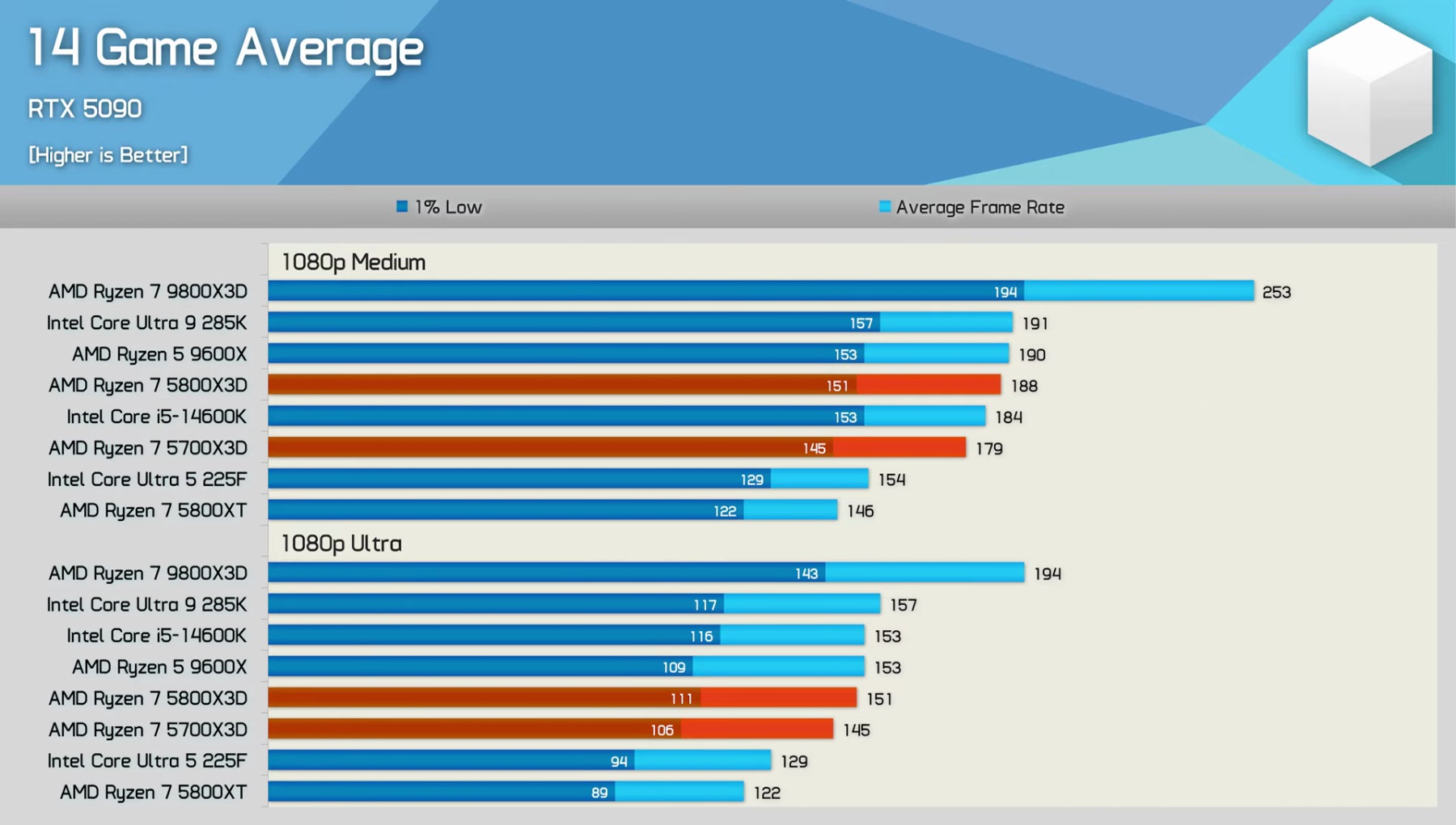Результаты тестов показали, что Ryzen 7 5800X3D обеспечивает высокую производительность в играх, сравнимую с такими моделями, как Ryzen 5 9600X и Core Ultra 9 285K. Процессор Ryzen 7 5700X3D уступает старшей модели в среднем всего на 5 % при использовании настроек «Medium» и на 4 % в режиме «Ultra». При этом Ryzen 7 9800X3D остаётся безоговорочным игровым лидером, заметно обгоняющим своих соперников.