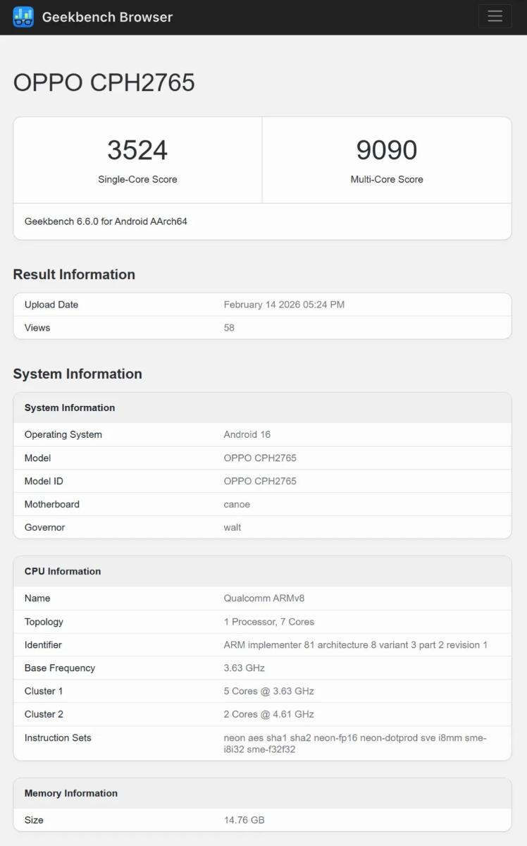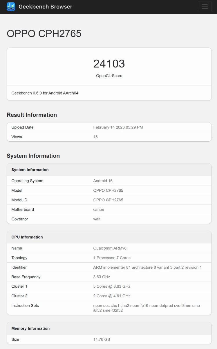 В базе данных Geekbench ещё не представленная официально версия чипсета Snapdragon 8 Elite Gen 5 работает в составе предстоящего смартфона Oppo Find N6 и имеет семь процессорных ядер с аналогичными стандартному варианту частотами — два ядра достигают тактовой частоты 4,61 ГГц, а остальные пять функционируют на частоте до 3,63 ГГц.
