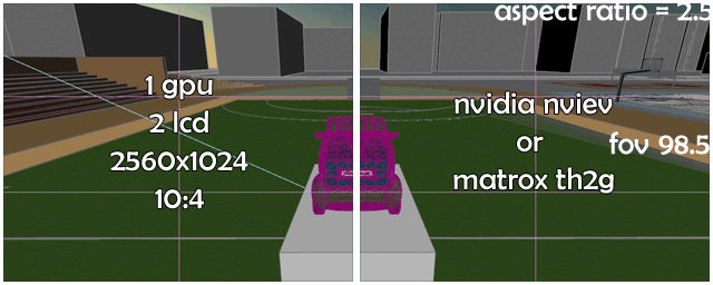 <br/>2. 1 видюха, 2 монитора работающие либо через нвидия нвью, либо триплхед в режиме 2х мониторов, единственный минус - рамка по середине, там где должен быть прицел