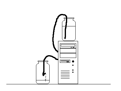 Когда вода в верхней банке подходит к концу, зажимаем нижний конец шланга, чтобы из него не вытекла вода и меняем банки местами. Вода уже потечет сама. Последний штрих: перегибаем нижний конец шланга так чтобы вода не бежала струйкой, а часто капала и фиксируем (например проволокой). Это практически не сказывается на эфективности системы, ввиду низкого коффициента теплообмена, но зато продлит время между сменами банок (у меня хватало часа на полтора). Конечно есть риск недоглядеть, но ведь система идет как вспомогательная к основной воздушной, поэтому ничего страшного не произойдет, просто процессор начнет медленно нагреватся и сработает программа мониторинга. Как вариант, можно ставить будильник. Я себе написал программку, которая через каждые час двадчать выдавала предупреждение.
