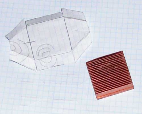 Она одевается на радиатор. В ней сверлятся два отверстия под штуцеры. Затем все спаивается. Идея мне понравилась и я стал более детально прорабатывать эскиз развертки корпуса будущего водоблока.