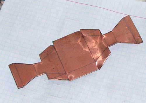 В начале планировалось сделать корпус из жести. А жесть взять, разрезав банку из под кофе. А потом спаять все 200 Ваттным паяльником, обычным оловянно-свинцовым припоем. Но оказалось, что последнее время мы пьем кофе из стеклянных банок, и жесть обломилась. Хорошо, что нашелся небольшой кусок тонкой листовой меди. Из него я заготовку и вырезал.