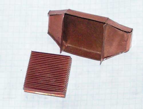 Медь для надежной пайки паяльником нужно зашкурить до ровного металлического блеска и облудить. Мне этого делать не захотелось, и я спаял корпус горелкой с МАРР газом, твердым припоем. Это конечно отступление от темы. Далеко не у каждого оверклокера есть такая горелка. Но что мешает использовать уже облуженную жесть от консервной банки, или зашкурить и облудить лист имеющегося в наличии металла? Придирка несущественна.