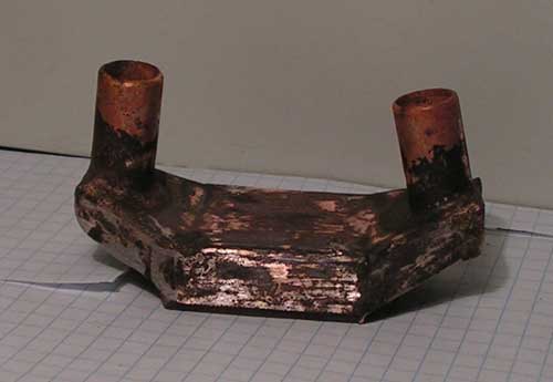 Я долго думал, как лучше организовать ток теплоносителя через такой радиатор. Как мне кажется наилучший вариант это штуцер, переходящий в раструб. Размеры широкой части раструба соответствуют размерам боковой грани радиатора. А сделать этот раструб можно из тонкого листового металла. Потом все это дело спаять.
