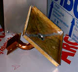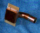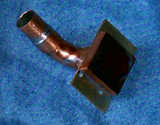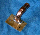 В латунной пластине сделано отверстие, и припаяна медная трубка с уголком диаметром 28 мм. Эта трубка будет соединять испарительную часть с зоной конденсации. В процессе теплообмена участвует только часть, прилегающая к процессору, поэтому материал крышки большой роли не играет. Так же в этой крышке просверлены отверстия для крепления к сокету, сокету А. Ну нравится мне АМD.