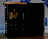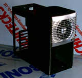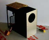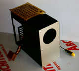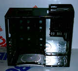 Ниже можно видеть фотографии начала работ над корпусом. Корзина под DVD и мобил рак приклепана. Теперь можно догадаться, как они будут расположены. Да, дивидишник будет открываться треем вверх. Вверх же будет извлекаться и контейнер мобил рак. Каркас покрашен автоэмалью из баллона. Окно вырезано ножницами по металлу. Стекла пока нет. Есть два варианта – акрил и «настоящее», силикатное, тонированное стекло. Не могу выбрать…