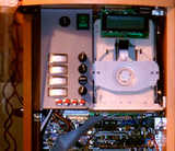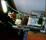 Вся панель держится на куске акрила 26,5 см на 21 см. Толщина 4мм. Верхний привод Teac, освобожден от верхней крышки и через стойки прикручен к акрилу. Нижний DVD Creative, привинчен к верхнему. В Teac замучена подсветка- 2 синих, ярких. Слева красные кнопки дублируют управление приводов. Про LCD писать не буду на любом моддерском сайте куча статей. LCD как LCD- 20 на 4.