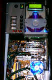 Ниже в куче проводов просматривается mobile rack. Это явление временное. Винт у меня старый, малооборотистый, почти не шумит. Достаточно было положить его в mobile rack через прокладки из пенофола, а вентилятор в нем на 5в. Заткнулся и почти не греется. После апгрейда поставлю конструкцию показанную в «моддерских хитростях»