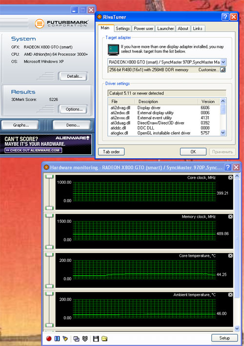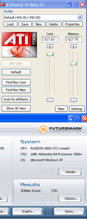 Разгон в этом случае производился двумя программами RivaTuner v2.0 ,15.8. и ATI Tool. Было интересно сравнить результаты.