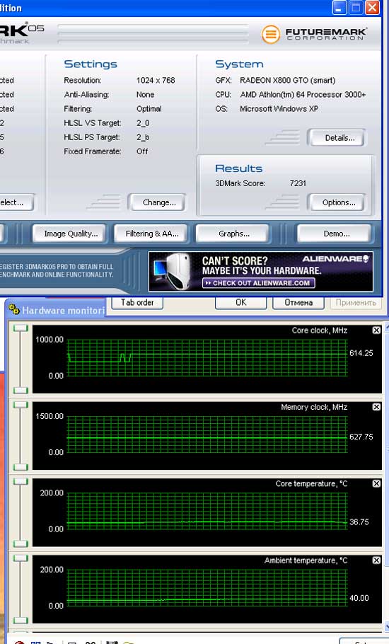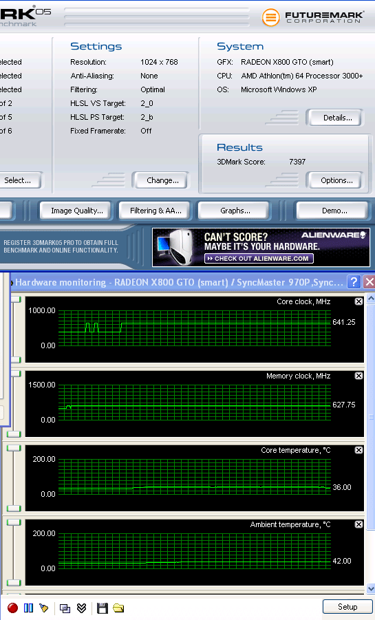Разгон будет проведен по такому же принципу, как в предыдущей статье про Sapphire Ultimate. Сначала со штатной системой охлаждения, затем с водяной и, наконец, с фреоновой. Производительность подобных видеокарт в играх достаточно хорошо изучена, поэтому тестироваться видеокарта будет только в одном тесте - 3DMark 2005 (настройки самого теста и драйвера видеокарты по умолчанию).