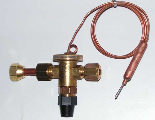 Принцип работы - седло-игла с регулируемым зазором между ними. С одной стороны на иглу давит пружина. А с другой, на иглу действует сила, создаваемая давлением паров в термобаллоне, которая зависит от температуры баллона. Разместив баллон на выходе испарителя можно получить постоянную степень перегрева рабочего тела. ТРВ автоматически позаботится, что бы не было ни перелива хладагента в испаритель, ни его недостатка, при резком повышении нагрузки.
