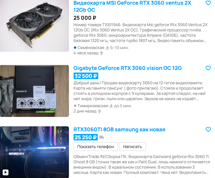 GeForce RTX 3060 уже какое-то время считается самой продаваемой видеокартой на рынке. Стоимость её максимально приблизилась к 300 долларам, а геймеры уже давно не видели ничего подобного. К сожалению, вы получите сильно устаревший продукт, главной отличительной чертой которого считается наличие 12 Гб видеопамяти. За 34 тысячи рублей вы сможете запускать любые игры в разрешении 1080р. С трассировкой лучей немного сложнее, но изучить данную технологию всё же можно. На несколько лет GeForce RTX 3060 вам точно хватит, но лучше берите новую в магазине, ведь продавцы на Авито ведут себя довольно странно. Смотрите, дешевле 25 тысяч купить GeForce RTX 3060 на вторичном рынке нельзя, тогда как на некоторые позиции цены превышают 32 тысячи рублей. Ну и какой смысл покупать у перекупщика, рисковать или брать старую видеокарту, если столько же стоит новая в магазине?