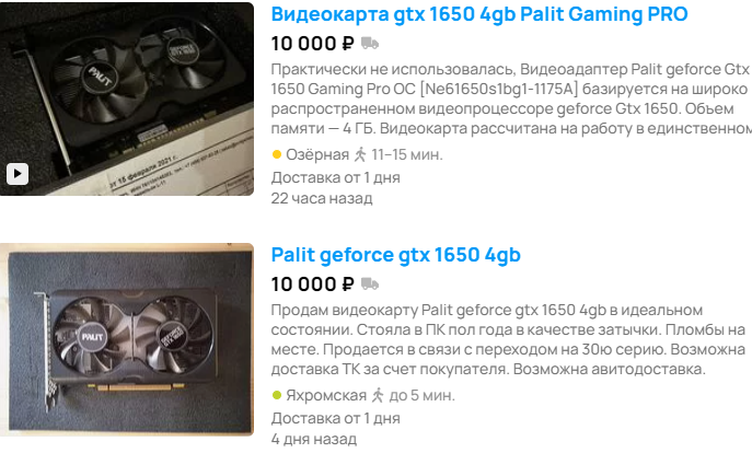 Мы не видим смысла глубоко анализировать российский рынок старых видеокарт, поскольку цены разнятся не сильно. Если где-то вам и предоставят скидку, то это будет частный случай, а иногда мошенники и вовсе заманивают наивных геймеров, подсовывая им нерабочий товар. Именно поэтому рассмотрим несколько позиций с Авито, а также видеокарты из Регарда. Начнём с самого бюджетного ценового сегмента до 20 тысяч рублей. Пожалуй, самой бюджетной видеокартой, которая соответствует званию игровой, считается GeForce GTX 1650. Сегодня мы можем назвать эту видеокарту игровой с очень большой натяжкой, поскольку она не тянет новинки в 1080р. В лучшем случае вам удастся выставить средние настройки графики в 720р, тогда как стоимость такой видеокарты довольно существенная. Согласитесь, что за 20 тысяч хочется получить что-то более серьёзное, но NVIDIA не готова снижать цены, а в итоге именно GeForce GTX 1650 остаётся самой недорогой игровой видеокартой на рынке. В Регарде модель производства MSI можно купить за 19 тысяч рублей, тогда как на Авито есть несколько интересных предложений за 10 тысяч. Если вы искали выгоду, то можете смело тратить 10 тысяч на видеокарту, ведь за такие деньги в магазине ничего не найти. Получается солидная выгода, которая позволит вам всего за 10 тысяч стать частью игрового сообщества. Если с деньгами напряжёнка, то лучше варианта просто нет.