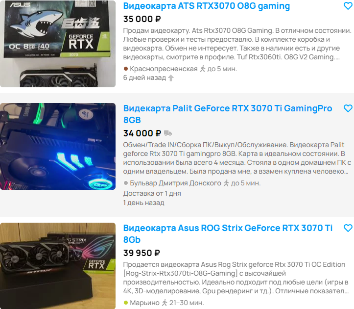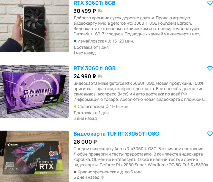 Как вы уже поняли, не все видеокарты на вторичном рынке выгодны, ну а мы рассмотрим более дорогую GeForce RTX 4060 Ti. Давайте обойдёмся без поиска аналогичного графического чипа на Авито, ведь GeForce RTX 3060 Ti практические ничем не уступает. Если не брать во внимание разницу в технологии масштабирования DLSS 2.0 и DLSS 3.0, то большая часть геймеров не сможет отличить видеокарты по скоростным показателям. В магазине GeForce RTX 4060 Ti стоит 45 тысяч, тогда как GeForce RTX 3060 Ti вы можете до 30 тысяч рублей. Думайте сами, хотите ли вы рисковать, ведь значительная часть таких видеокарт работала на фермах, где годами копала Эфир. Если вам повезёт, то GeForce RTX 3060 Ti будет в нормальном состоянии, или может оказаться выжата, словно старый лимон. Думайте сами.