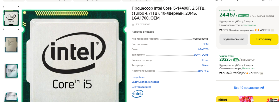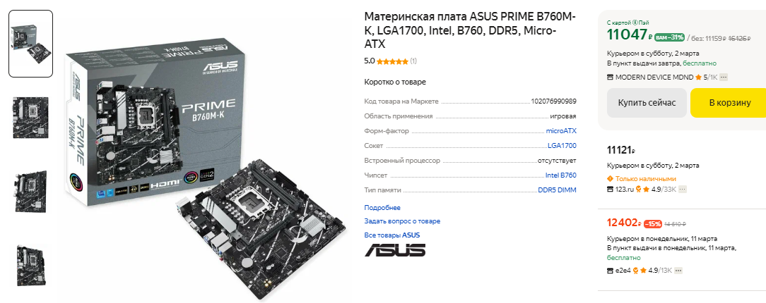 Для игровой перспективной сборки подойдёт Core i5-14400F. Процессор не обладает ультимативной скоростью, но очень хорошо себя показывает в игровых задачах. Смотреть на 10 ядер мы настоятельно не рекомендуем, ведь это простой маркетинг, призванный привлечь внимание потенциальных покупателей. Главным минусом данного процессора является низкая тактовая частота. У AMD в данном ценовом сегменте всё намного лучше, но быть фанатом Intel непросто, поэтому приходится страдать. Жизненный цикл у Core i5-14400F большой, а сам процессор легко справится с видеокартой следующего поколения, которую вы решите купить через несколько лет. У камня есть один минус, ведь он принадлежит к последнему поколению на базе сокета LGA1700. Увы, но уже в 2024 году новые процессоры окажутся несовместимы с вашей материнской платой, ну а это большой минус. Кстати, в качестве материнской платы можно взять ASUS PRIME B760M-K. Она основана на не самом бюджетном чипе, хотя не предполагает разгон. Обычно геймеры, покупающие Core i5-14400F, оверклокингом не занимаются, поэтому всё в полном порядке. Материнская плата поддерживает оперативную память DDR5, поэтому будьте готовы потратиться. Покупать DDR4 для новой системы мы вам крайне не советуем. Прошлое поколение ушло в историю, поэтому стоит смотреть в будущее и не пытаться экономить на мелочах. Сама материнская плата ещё и компактная, а значит вам удастся собрать не только компьютер на Intel, но и поместить его в небольшой корпус.