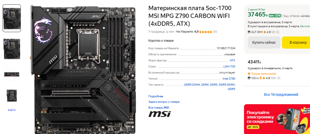 Остальные комплектующие мы рассматривать не будем. Давайте сделаем это в одном из следующих материалов, ведь нас интересует только процессоры, материнские платы и видеокарты. Что же, если вы задумали собрать серьёзную машину, то следует остановиться на Core i7-14700KF. Это настоящий монстр, который справляется с любыми задачами и отлично чувствует себя в играх. Берём версию без встроенного графического чипа, поскольку мы всё равно собираем игровой ПК. Камень получил тактовую частоту 5.6 ГГц, что делает его невероятно быстрым, а в игровых тестах он занимает одно из верхних мест. Помните, что Ryze 7 7800X3D быстрее и в сборке дешевле, но такие вещи объяснить фанатам Intel бывает непросто. Так вот, под такой процессор нужно брать только правильную материнскую плату с разгонным потенциалом. Согласитесь, что покупать Core i7-14700KF, а после довольствоваться штатными тактовыми частотами – это настоящее преступление. MSI MPG Z790 CARBON будет вполне достаточно. Если деньги жмут ваши карманы, то можно побаловать себя чем-то более серьёзным, но для начинающих оверкокеров вполне сойдёт. Данная материнская плата предлагает обширные настройки и при правильном подходе сможет прибавить вам ещё пару сотен МГц к процессору. Придётся постараться, а в этом случае без системы жидкостного охлаждения не обойтись.