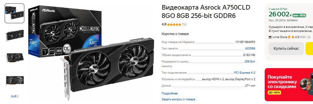 Ну а поскольку мы решили в качестве основы брать только продукцию Intel, то покупаем видеокарту Arc A750. Что бы вам было немного проще – это прямой аналог GeForce RTX 3060. В российских магазинах за видеокарту NVIDIA просят от 30 тысяч рублей, ну а здесь у нас есть реальный шанс неплохо сэкономить. Помните, что во многих играх Arc A750 ещё и выходит вперёд, что неподготовленным геймерам может показаться манной небесной. И всё бы ничего, но Intel до сих пор не привела драйверы в порядок. Что касается новинок, то проблем не будет. Скорее всего. Но если вы решите запустить игру, вышедшую 5 лет назад, то с высокой долей вероятности Arc A750 окажется там ощутимо медленнее, чем GeForce RTX 3060. Что поделать, за всё приходится платить. Кстати, у Intel есть фирменная технология масштабирования под названием Xess. Она немного хуже AMD FSR и ощутимо слабее NVIDIA DLSS. Словом, покупка видеокарты Intel имеет смысл, ведь она выгоднее, но такой выбор всё же имеет последствия. Кстати, видеокарта имеет 8 Гб видеопамяти и 256-битную шину.