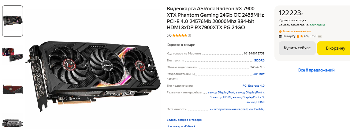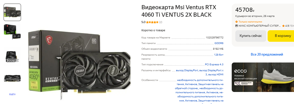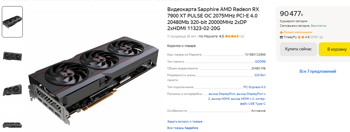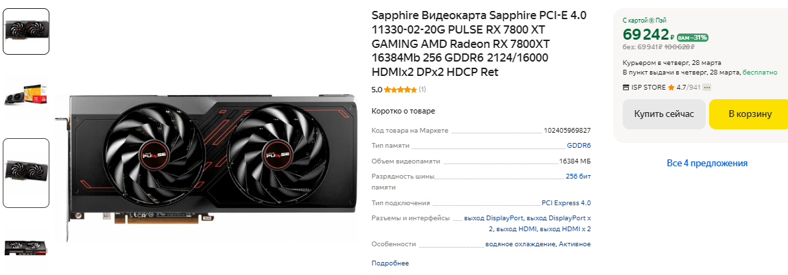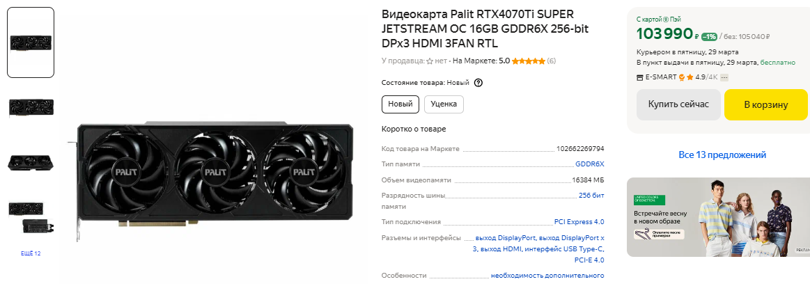 Чуть дороже 100 тысяч рублей в продаже есть GeForce RTX 4070 Ti SUPER. Это настоящий игровой монстр, который имеет на борту 16 Гб видеопамяти и не имеет проблем с любыми играми даже в 4К. Слабых сторон у видеокарты нет, а сама она считается одной из лучших в своём классе. Пожалуй, мы бы её вам даже порекомендовали, если бы Radeon RX 7900 XT не была на целых 10 тысяч рублей дешевле. Ну а видеокарта AMD обходит свою конкурентку в играх и предлагает более внушительные характеристики. Это 20 Гб видеопамяти и 320-битная шина, что играет важную роль при запуске сложных сцен в требовательных играх. GeForce RTX 4070 Ti SUPER действительно очень хорошо себя показывает в играх, но наличие Radeon RX 7900 XT в данном ценовом сегменте спутало зелёным все карты. Если не пытаться придумывать несуществующие преимущества и рассказывать о ценности трассировки лучей, то однозначная победа уходит в копилку красной команды.