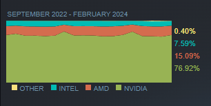 Прежде чем обсуждать преимущества и недостатки видеокарт NVIDIA, следует знать важную статистику. Ну а факты свидетельствуют о том, что 77% всех геймеров предпочитают продукцию дядюшки Хуанга. Видеокарты AMD продаются плохо, а компания пока не может вернуть утерянную ранее часть рыночной доли. Каждое новое поколение вызывает пессимистичнее настроения, а спорная ценовая политики и масса маркетинговых ошибок только усугубляет положение. В итоге только 15% геймеров в Steam инвестировали в видеокарты производства AMD. Не исключено, что цифра могла быть больше, но тут на горизонте появилась Intel, которая отняла у красных 7.5% геймеров. Если верить статистике ведущих аналитиков, то показатели в Steam несколько отличаются от указанных выше, а в итоге реальная рыночная доля NVIDIA ещё больше, тогда как Intel занимает чуть больше 1% рынка настольной графики.
