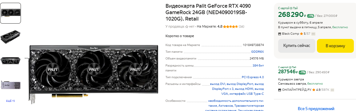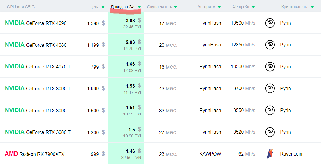 Мы не будем забивать вам голову сложными терминами и перечислять десятки популярных криптовалют. Раньше многие майнеры годами работали со стабильными настройками, ну а в 2024 могут раз в неделю переводить своё железо на новые алгоритмы. Ethereum Classic продолжает привлекать фермеров, но только в виде долговременной инвестиции, ведь получить прибыль на этой криптовалюте невозможно. Так вот, существует несколько способов инвестирования в добычу на видеокартах. Наиболее состоятельные шахтёры предпочитают покупать новые флагманы, которые имеют максимальную производительность и высокий хешрейт. Если обратиться к актуальному калькулятору, то можно заметить, что на первом месте по показателю дохода за 24 часа находится GeForce RTX 4090. Цены в таблице довольно странные и не соответствуют действительности. Купить флагман NVIDIA дешевле 2000 долларов сложно даже в США, ну а в российской рознице цены стартуют с 240 тысяч рублей. Одна из популярных моделей стоит почти 270 тысяч, поэтому мы можем с уверенностью заявить, что российские майнеры не покупают такие дорогие видеокарты для добычи криптовалют.