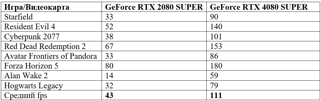 В итоге именно GeForce RTX 4080 SUPER остаётся отличной альтернативой для тех, у кого нет желания тратить такие огромные суммы на развлечения. Что же, сегодня мы хотим поднять любопытную тему, потратив немного времени на тесты. В левом углу ринга у нас GeForce RTX 2080 SUPER, которая вышла в далёком 2019 году, ну а в правом разместилась новая GeForce RTX 4080 SUPER. Давайте изучим результаты тестов команды Testing Games, а после сделаем выводы. Начнём с того, что использовался процессор Core i9-13900K, а разрешение дисплея было выставлено на 2К. Вообще, GeForce RTX 4080 SUPER создана для покорения требовательных новинок в 4К на максимальных настройках графики, вот только владельцы этой видеокарты знают, что достичь таких показателей с включённой трассировкой лучей не выйдет. Ну а данное тестирование ставит обе видеокарты в максимально некомфортные условия, где трассировка лучей выставлена на максимум, а технология масштабирования не активна. Обратите внимание на таблицу выше, которая позволяет сделать выводы о реальных возможностях каждой из видеокарт.