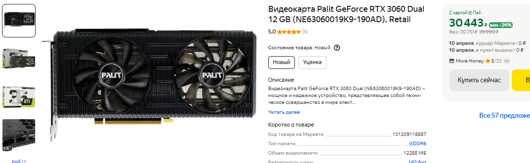 Далее я рассматривал GeForce RTX 3050, которая уже сегодня не тянет все игры в разрешении 1080р на высоких настройках графики. 12 ноября за эту видеокарту просили 26 тысяч рублей, ну а сегодня я нашёл идентичную модель производства Palit на 2500 рублей дешевле. Хочу сразу заметить, что цены в рознице могут меняться. Иногда я составляю материал, утром на следующий день он публикуется, а уже к вечеру вместо 70 тысяч за видеокарту просят 73. Бывает и так, что цена незначительно корректируется вниз, но в целом я фиксирую несистемные колебания, происходящие в рамках одного магазина на «ЯндексМаркете». В итоге подобные изменения никак не влияют на общую картину, а иногда можно встретить более и менее выгодные предложения.
