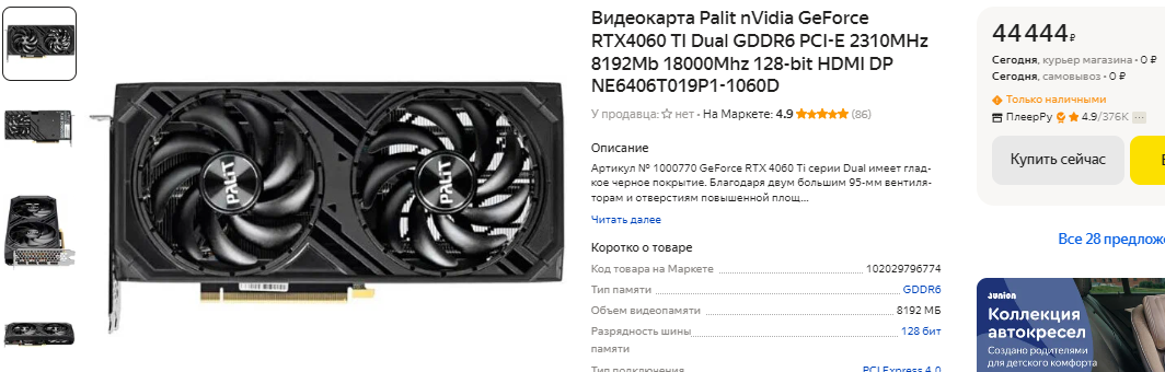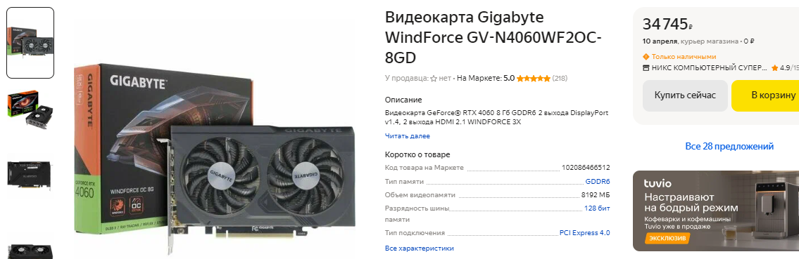 Как видите, в ноябре 2023 за GeForce RTX 3060 просили 34 580 рублей, ну а сегодня точно та же модель стоит на 4 тысячи дешевле. Удивительно, где же заявленное подорожание на 40%? Давайте считать. Предположим, что GeForce RTX 3060 действительно подорожала на 40%, а значит должна была стоить в конце 2023 года около 25 тысяч рублей. Вы встречали в конце прошлого года такую видеокарту за 25 тысяч? Я – нет. Пойдём дальше. За GeForce RTX 4060 Ti в ноябре 2023 просили почти 46 тысяч, ну а сегодня такую видеокарту я нашёл за 44 тысячи. У меня нет никакого желания подбирать именно те модели, указанные в прошлом материале, ведь суть в общем подорожании, которое я пока никак не могу нащупать.