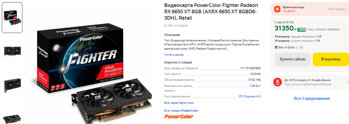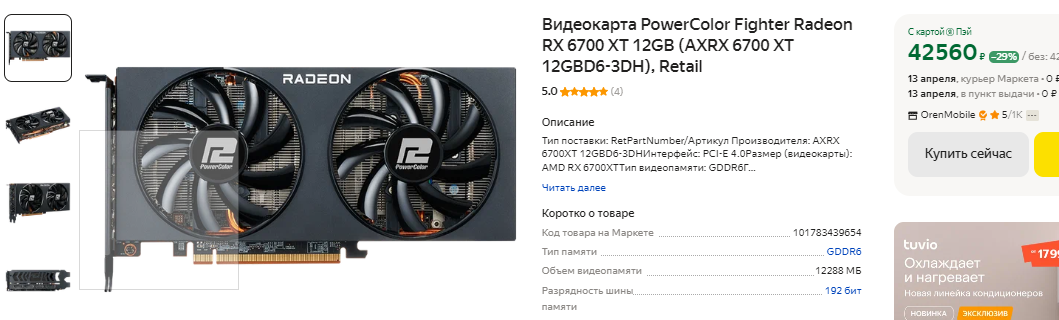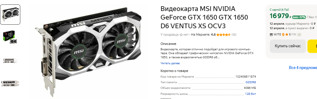 За GeForce GTX 1650 12 ноября просили 19 тысяч рублей. За такие деньги я вам крайне не советовал брать эту видеокарту, ну а сегодня можно найти аналогичный графический чип производства MSI за 17 000. Учтите, что жизненный цикл GeForce GTX 1650 уже давно завершился, поэтому запускать на этой видеокарте требовательные новинки придётся на самых низких настройках графики. Я бы такую видеокарту не купил, но в данном случае мы с вами видим, что и в бюджетном ценовом сегменте никакого подорожания нет.