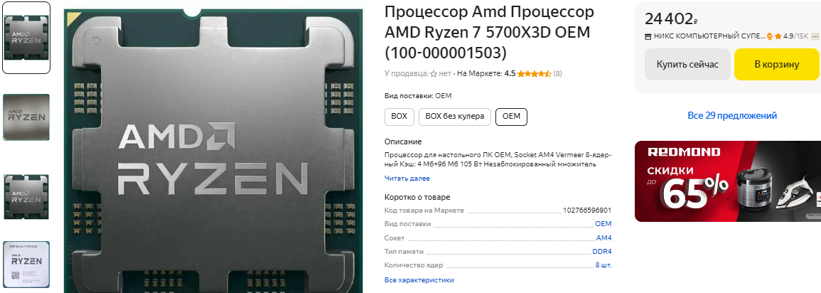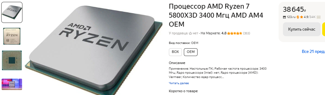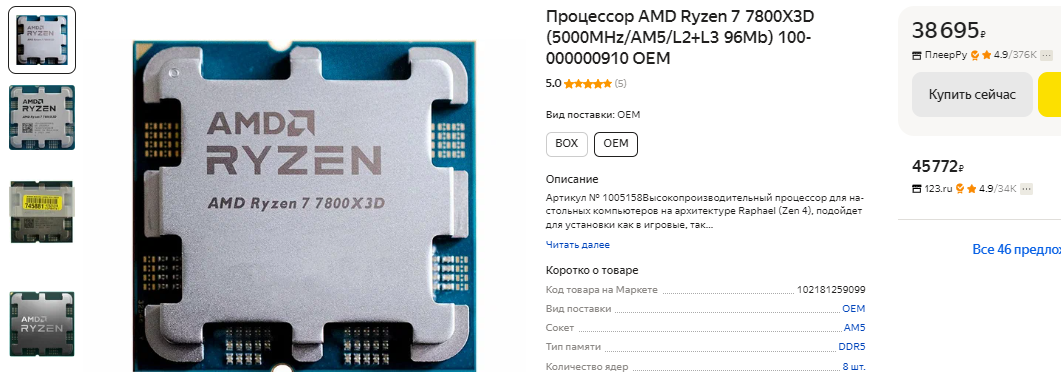 Как же так, ведь это нарушает все рыночные законы? Что же, даже этому есть логичное объяснение. Похоже, AMD уже не выпускает процессор Ryzen 7 5800X3D. Сегодня в рознице мы видим остатки, ну а речь и самом быстром игровом процессоре для сокета АМ4. Представьте себе, что у вас уже есть довольно неплохой компьютер, которому для полного счастья не хватает только процессора. Можно было бы задуматься о покупке Ryzen 7 7800X3D, но в этом случае вам придётся купить не только сам камень, но и к нему материнскую плату и оперативную память. Стоит такое удовольствие ещё + 25-30 тысяч рублей, ну а Ryzen 7 5800X3D можно поставить в компьютер без дополнительных растрат. В этом случае становится ясно, почему между процессорами почти нет разницы в стоимости, ну а собирать новый системный блок на базе Ryzen 7 5800X3D мы вам всё же не рекомендуем. Сегодня потенциала этого процессора для игр достаточно, но требования растут быстро, а в будущем вы не сможете усилить потенциал своего компьютера. Уже сегодня самые быстрые видеокарты упираются в нехватку мощности Ryzen 7 5800X3D, ну а через 4 года всё станет только хуже.