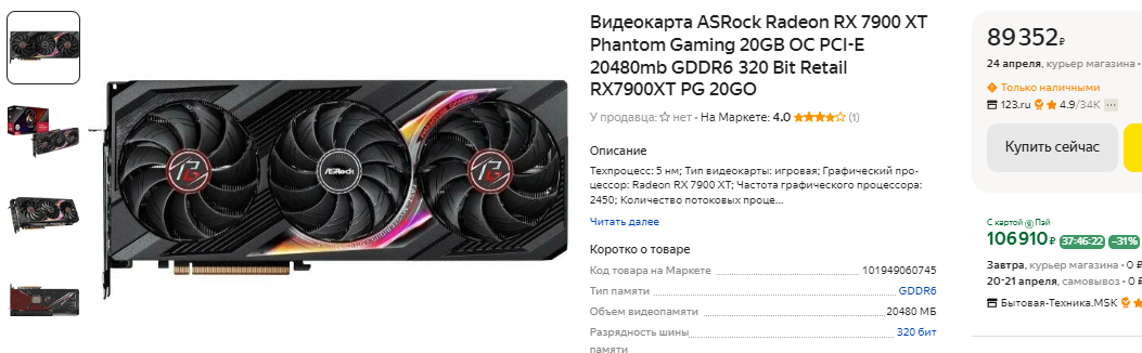 90 тысяч рублей просят за Radeon RX 7900 XT. Это не самая быстрая видеокарта на планете, но точно одна из самых удачных в портфолио AMD. Эксперты отмечают, что решающим здесь остаётся конечная стоимость, ну а в России за такую видеокарту просят почти 900 долларов. Как видите, сегодня в Европе Radeon RX 7900 XТ можно купить на целых 180 евро дешевле, чем в России, ну а это очень плохая информация для тех, кто смотрит в сторону флагманских решений для запуска игр в разрешении 4К. Происходящее можно назвать попытками спекулировать на низком спросе, ведь общеизвестно, что на отечественном рынке покупателей Radeon RX 7900 XT ощутимо меньше, чем в Германии.