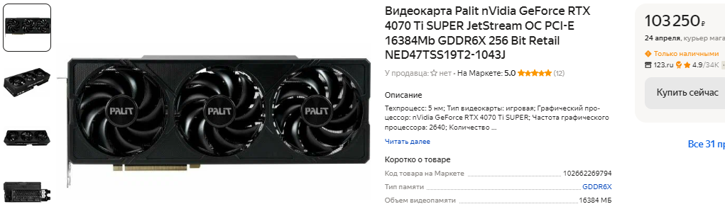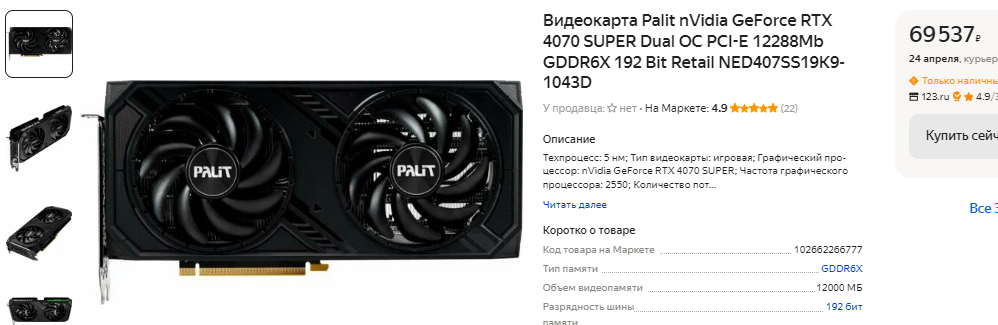 Найти дешевле 69 тысяч рублей GeForce RTX 4070 SUPER нам не удалось, ну а это целых 690 евро. Так дорого эта видеокарта не стоила даже на старте продаж, а сегодня цена её снизилась до 600 евро. Как видите, чем мощнее видеокарта, тем выше разница между её стоимостью на российском и европейском рынке. Ну и давайте рассмотрим GeForce RTX 4070 Ti SUPER. В немецкой рознице купить такую видеокарту вы можете за 849 евро, ну а высокая стоимость вполне объяснима, поскольку здесь установлено 16 Гб видеопамяти и 256-битная шина. В России за GeForce RTX 4070 Ti SUPER вам придётся отдать больше тысячи евро, ну а это уровень более мощных графических чипов. Давайте на этом остановимся, поскольку дальше всё становится только хуже.