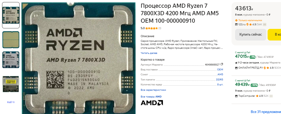 Брать процессор Intel для игр мы не будем, поскольку продукция этой компании дорогая и страдает от проблем со стабильностью. Именно поэтому остановимся на Ryzen 7 7800X3D, который не только демонстрирует ультимативные скоростные характеристики, но и стоит чуть выше 43 тысяч рублей. Учтите, что процессор ещё и обладает уникальным потенциалом для апгрейда, а в целом продукция AMD признаётся экспертами более оптимальной для покупки здесь и сейчас. Ryzen 7 7800X3D чрезвычайно хорош в играх, но может разочаровать тех, кто использует компьютер для работы. Увы, но идеальных предложений не существует, ну а мы собираем систему для разумного геймера, поэтому покупаем именно Ryzen 7 7800X3D.