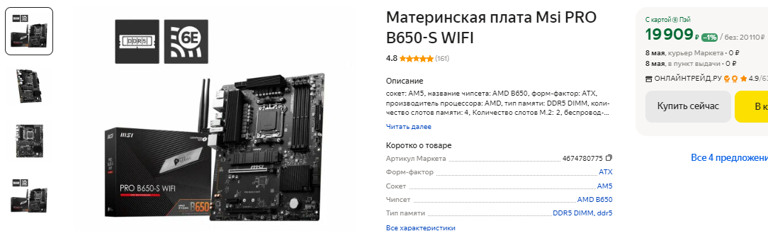 Предположим, что потенциальный покупатель игрового ПК хочет уделить немного внимания разгону. Усилить процессор не выйдет, а вот оперативная память способна выдать дополнительные 5%. Решайте сами, хотите ли вы тратить время на то, чтобы вместо 100 кадров в секунду во всех играх получить целых 105 fps. Разницу удастся увидеть только в тестах, но на нашем сайте достаточно оверклокеров, поэтому предлагаем взять материнскую плату Msi PRO B650-S WIFI. Это не самый идеальный вариант для разгона, но вы получите отличную возможность для экспериментов. Плата содержит все актуальные интерфейсы, включая 2 слота под твердотельные накопители форм-фактора М.2. Есть поддержка беспроводного интернета и других технологий. Можно было бы сэкономить, купив плату дешевле, но мы ведь собираем очень мощный игровой компьютер, поэтому не станем мелочиться.