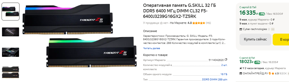 Именно поэтому остановимся на оперативной памяти производства G.SKILL. Тесты доказывают, что 16 Гб ОЗУ позволяют не испытывать проблем, но мы будем ориентироваться на потенциал, поэтому купим две линейки общим объёмом 32 Гб. DDR5-6400 будет весьма кстати и буквально создана для экспериментов. Помните, что перед вами не самый дорогой вариант, поэтому подходите к разгону без фанатизма. Иногда удаётся снизить завышенные тайминги, но в целом как поступить с данным комплектом ОЗУ – это уже ваш выбор.