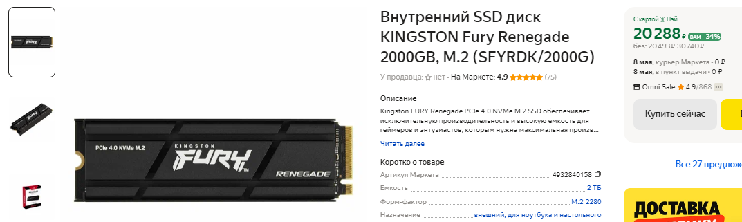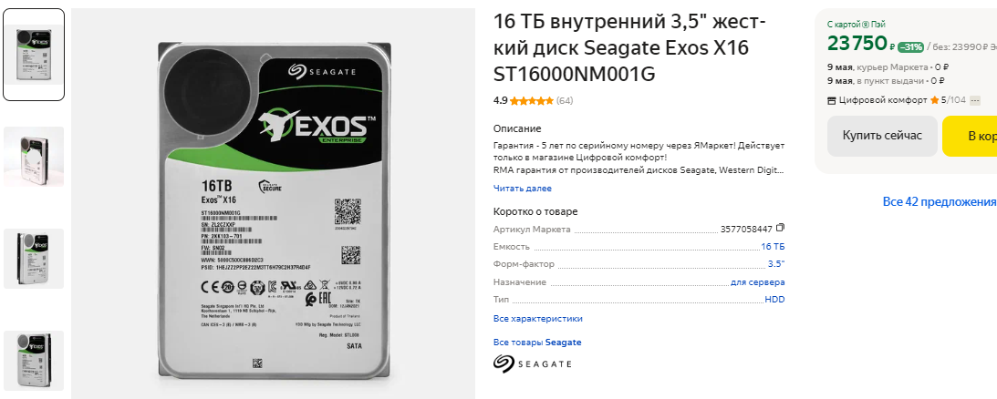 Ну а поскольку современный игровой компьютер не может обойтись без скоростного твердотельного накопителя, то мы добавим в корзину невероятной быстрый KINGSTON Fury Renegade. Скорость чтения достигает 7300 МБ/с, что в разы превышает потребности обычного пользователя. С таким SSD ваши игры будут устанавливаться за несколько минут, что вместе с правильной видеокартой позволит забыть о длительной загрузке уровней. Переходы между локациями и вовсе сократиться до минимума, ну а указанные выше комплектующие помогут ускорить этот процесс. 2 Тб ёмкости достаточно для любых игр, но что делать тем, кто хочет использовать компьютер для хранения коллекции видео? Ответ есть, и это жёсткий диск Seagate Exos X16. За скромные 23 тысячи рублей вы получите целых 16 Тб свободного пространства. Пожалуй, этого будет достаточно даже для фанатов сериалов, ведь на накопитель поместится больше, чем вы сможете посмотреть за 10 лет. Идеальный комплект для тех, кто опасается отключения интернета или других катаклизмов.