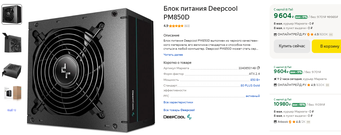 Для хорошей игровой сборки нужен надёжный блок питания. Можно было бы поставить внутри что-то за 25 тысяч рублей, но в данном случае такие растраты не окупятся. Берём Deepcool PM850D, в котором качество соседствует с солидным запасом мощности до 850 Вт. Этого будет достаточно для нашего комплекта, ну а в большинстве сценариев блок питания порадует вас едва заметным гулом кулера. Поддерживается стандарт энергоэффективности 80 PLUS Gold, что свидетельствует о высоком качестве сборки данного устройства.