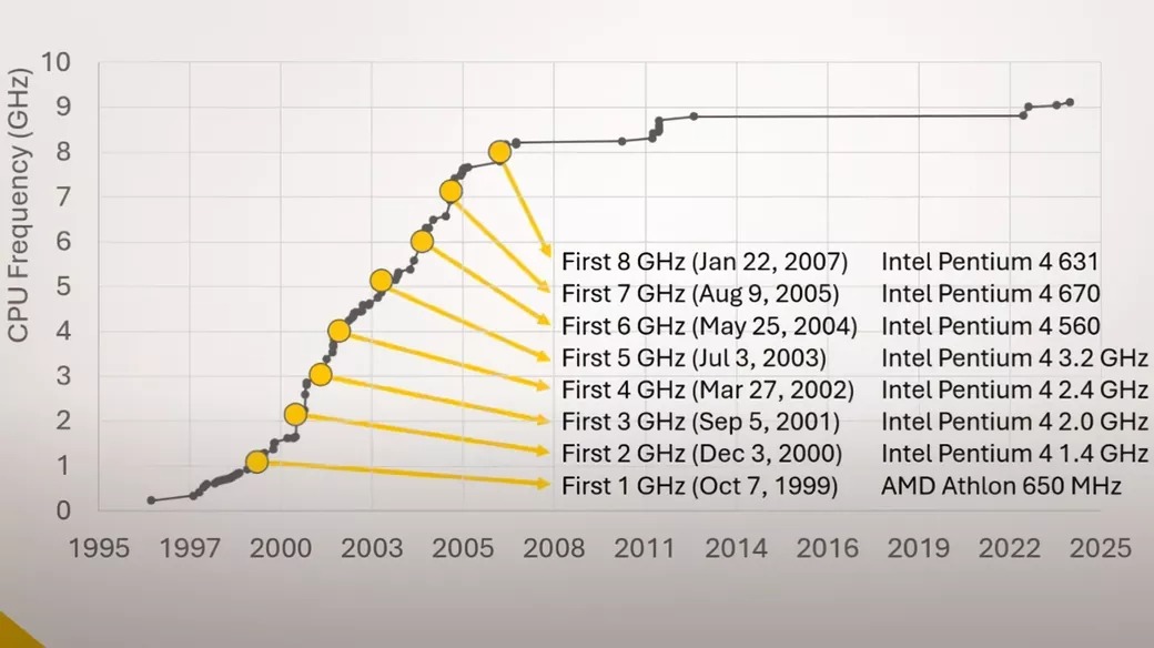 Удивительно пластичные Intel Pentium 4 позволили повысить тактовую частоту до 6 ГГц в мае 2004 года, ну а уже в 2005 при помощи жидкого азота удалось поднять тактовые частоты выше 6 ГГц. Казалось, что впереди новые рекорды, но после 2007 года разгон встал на паузу. Именно тогда оверклокерам покорились 8 ГГц, после чего была взята пауза длиной в 15 лет. В конце 2022 флагман Intel разогнался до 9 ГГц, ну а действующий рекорд принадлежит ElmorLabs и составляет 9117 МГц. Даже Core i9-14900KS не может выдать больше, ну а о покорении 10 ГГц остаётся только мечтать. Оверклокеры отмечают, что уже 15 лет прогресс остановился, ну а причине лежат в архитектуре х86, которая многими экспертами признана неэффективной и устаревшей. Поговаривают, что на замену старой архитектуре идёт массовое внедрение ARM, но пока мы видим единичные примеры, которые не способны повлиять на рыночный спрос. Эксперты признают, что современные процессоры ушли далеко вперёд в плане энергоэффективности, но ключевая проблема так и не была решена. Это значит, что 10 ГГц при текущем развитии технологии достичь не удастся, а каждая новая серия прибавляет несколько процентов.