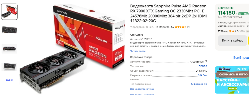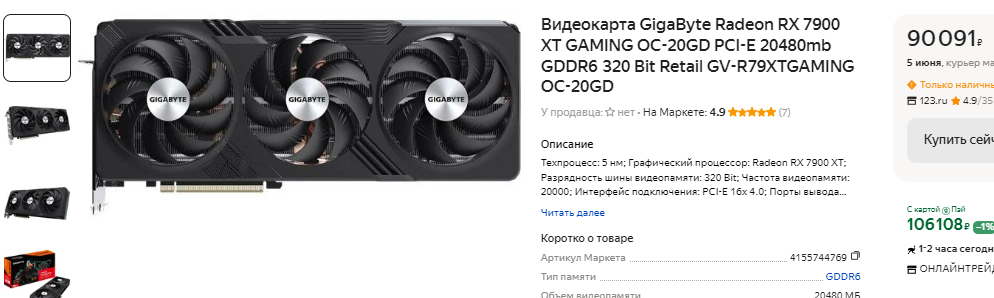 Если посмотреть немного шире, то можно вспомнить несколько видеокарт производства AMD. К примеру, за Radeon RX 7900 XTX просят 114 тысяч, но сама видеокарта превосходит старый флагман NVIDIA во всех сценариях. При этом здесь можно встретить те же 24 Гб памяти и пиковую производительность, превышающую показатели GeForce RTX 3090 Ti на 30-40%. Хотите дешевле – берите Radeon RX 7900 XT. По цене одной GeForce RTX 3090 Ti вы можете собрать полноценный игровой компьютер с мощным процессором и видеокартой Radeon RX 7900 XT, которая предложит 20 Гб памяти и высокую производительность.