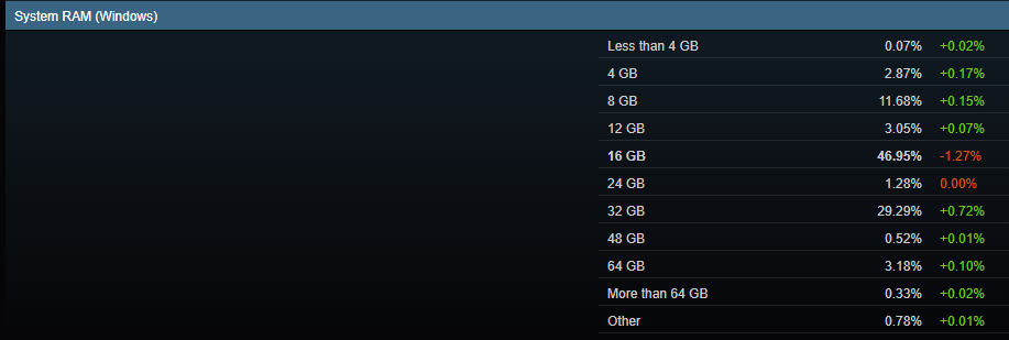 Если обратить внимание на статистику Steam, то можно сделать вывод, что примерно 47% всех геймеров владеют компьютерами с 16 Гб ОЗУ. Чуть больше 29% позволили себе 32 Гб, тогда как всего 3.2% купили 64 Гб. Ещё 11.7% довольствуются 8 Гб, но очень многое зависит от запросов того или иного геймера. Многие не запускают требовательные новинки, а значит не нуждаются в мощном железе. Сколько же нужно купить оперативной памяти? Давайте разбираться, а поможет нам в этом новое тестирование, проведённое каналом Hardware Unboxed. Авторы взяли процессор Ryzen 7 7800X3D в комплекте с видеокартой GeForce RTX 4090. Тесты проходили в разрешении 2К, ну а ниже вы можете увидеть итоговую таблицу.